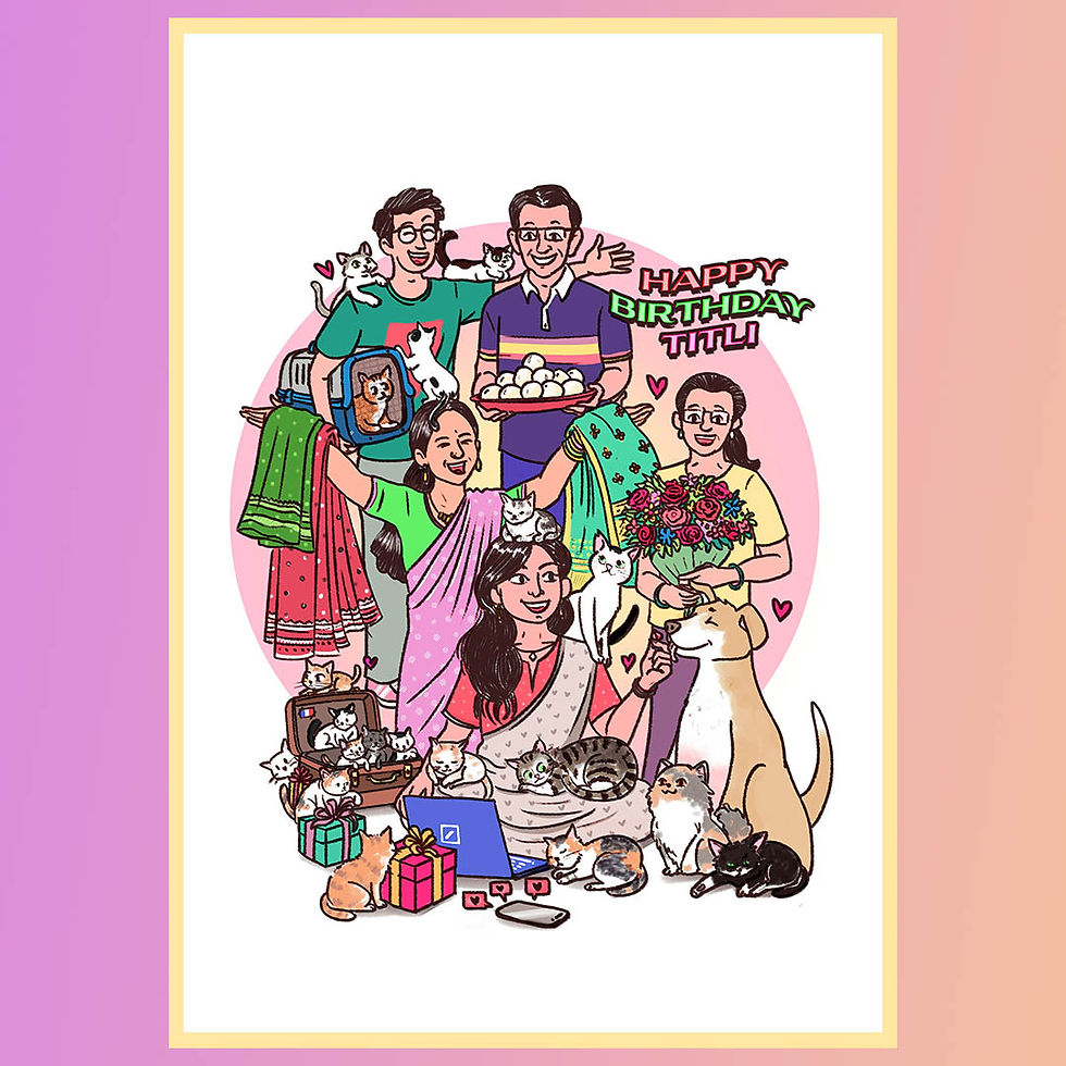 An illustration created as a birthday gift for my wife, celebrating her world and the people (& animals) closest to her. The artwork features her family — each captured through a characteristic gesture: her mother suggesting sarees, mother-in-law offering flowers, her father presenting rasgullas, and me participating in our shared animal-rescue efforts.